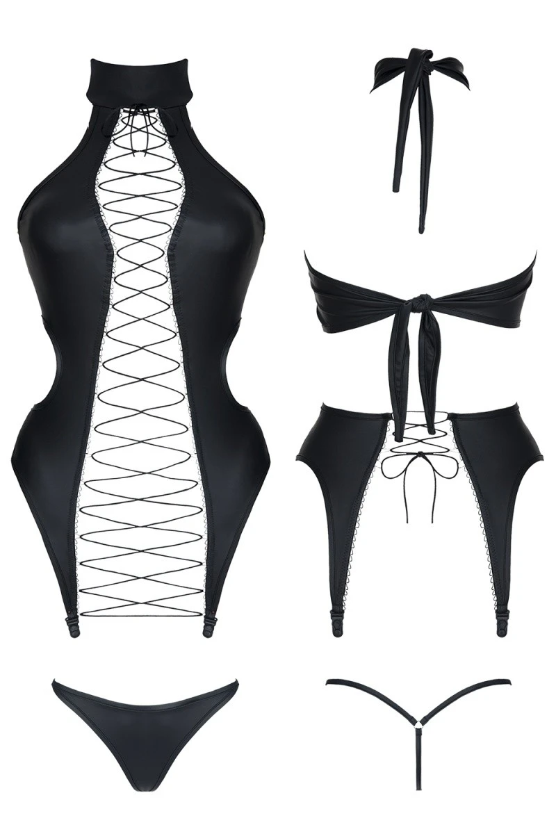 Et pour pimenter le tout, on ajoute une matière laquée ultra moulante avec son soupçon de brillance qui donner se petit côté bad-girl tant désiré. Les jarretelles fixes permettront d’ajouter les bas proposés en option ou ceux de votre choix.