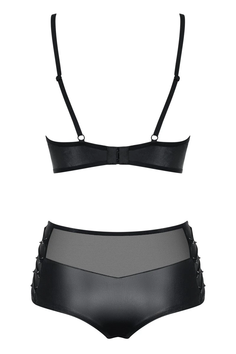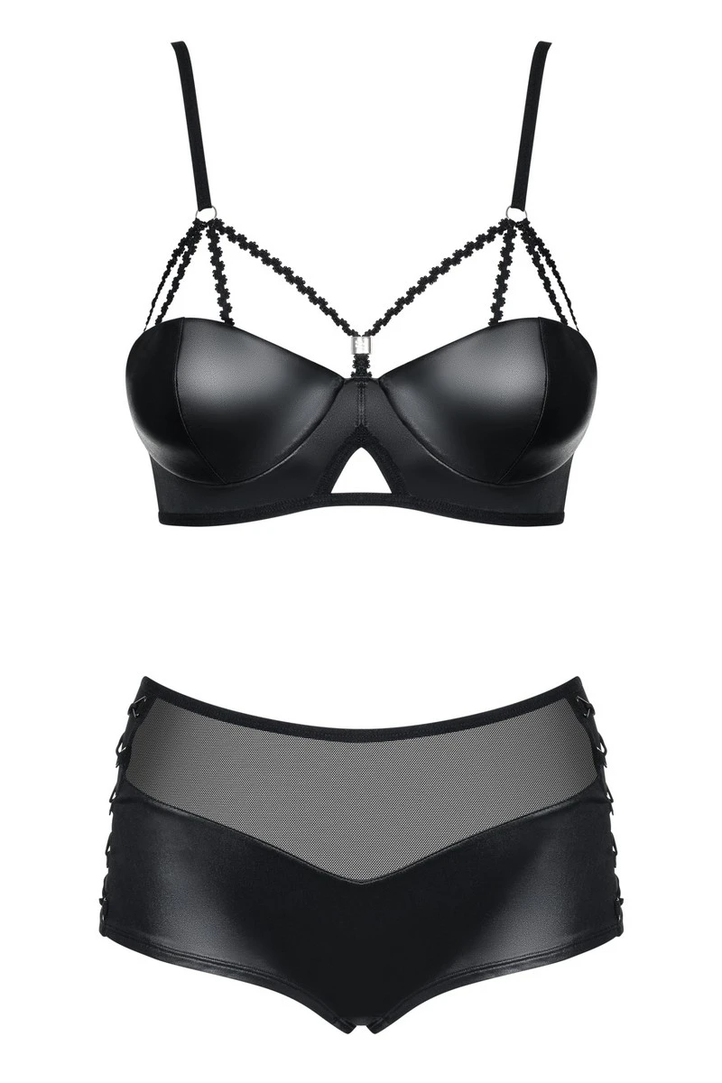 Comme un aspect rétro, l’ensemble Leatheria reprend d’anciens codes avec les matières d’aujourd’hui dans un mélange absolument réussi. Le soutien-gorge est comme un balconnet pour porter la poitrine par le dessous. On y trouve un fin rembourrage pour garder un arrondi harmonieux, et des armatures sous-poitrine qui assureront leur maintien. Les bretelles réglables ajoutent une petite note de sensualité qui accentuera le galbe des seins.