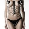 La poitrine sera mise en valeur par un mélange de résille qui laissera le haut visible, puis d’un vinyle brillant qui rendra le dessous opaque. Une ceinture passera au centre tout en apposant un jeu de rivets métalliques importants pour appuyer votre look et attiser la curiosité.