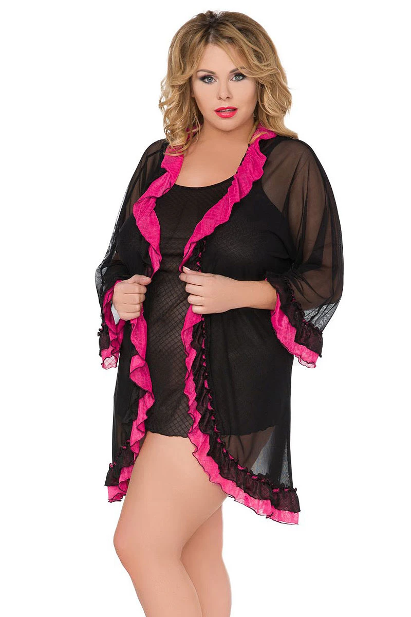 Le déshabillé Carine inspire une totale féminité avec des bordures roses qu’on ne pourra manquer du regard. Une matière douce et transparente qui laissera le corps visible confectionne cette lingerie glamour. La nuisette à pois également transparente est incluse. Une tenue complète prête à séduire.
