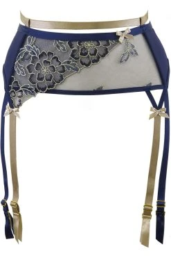 Son jeu de couleurs alliant le bleu nuit et l’or sera du plus bel effet pour vous offrir une tenue raffinée et parfaitement tendance. Ses doubles jarretelles sont ajustables en hauteur pour pouvoir ajouter les bas que vous préférez à votre parure. Fermeture au dos par des agrafes.