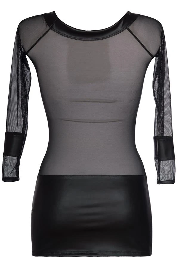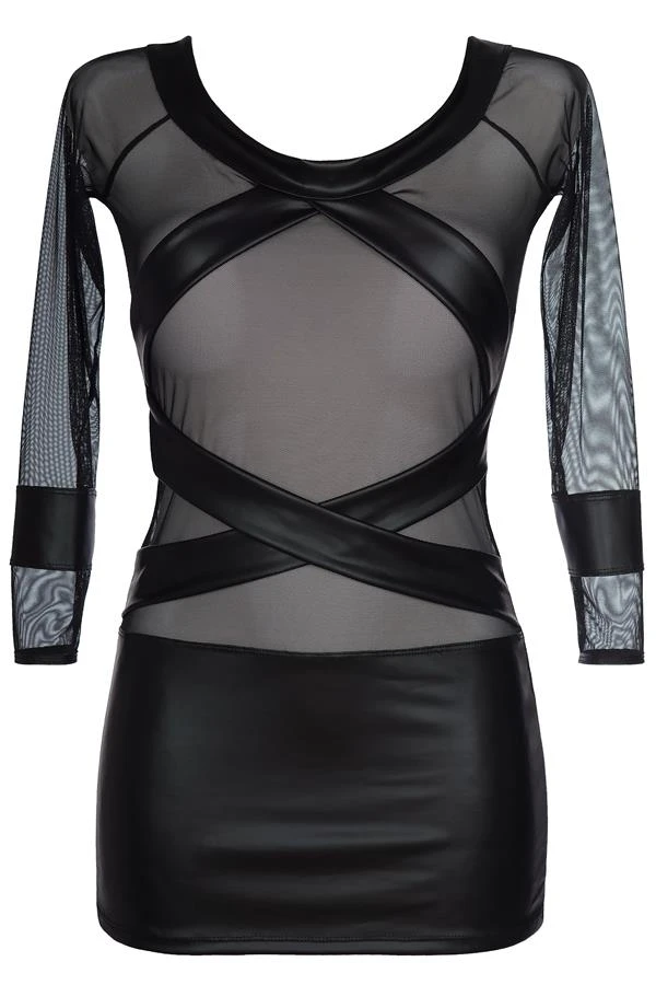 Toute l’intensité de la transparence révélée dans la robe wetlook V-8419 sera pour vous l’occasion de vous faire remarquer. Cette robe sexy arbore un généreux col arrondi qui prend soin de dénuder le haut des épaules. Les parties noires sont opacifiées par une texture imitation vinyle des plus audacieuses ; cette matière donne un charme assuré et se combine joliment avec la résille transparente.