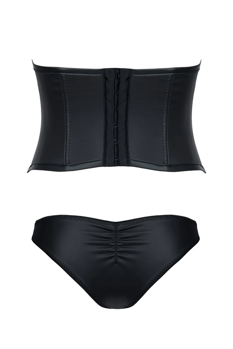 De dos, on aperçoit une rangée d’agrafes qui fermeront la lingerie. Pas de réglage, la matière extensible s’adaptera à votre corps. La culotte échancrée et joliment plissée incluse.