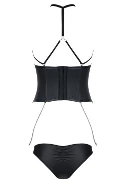 Vue de dos, on aperçoit une rangée d’agrafes qui fermera la lingerie. Pas de réglage, mais une matière extensible qui s’adaptera à votre corps. La culotte échancrée et joliment plissée est incluse.