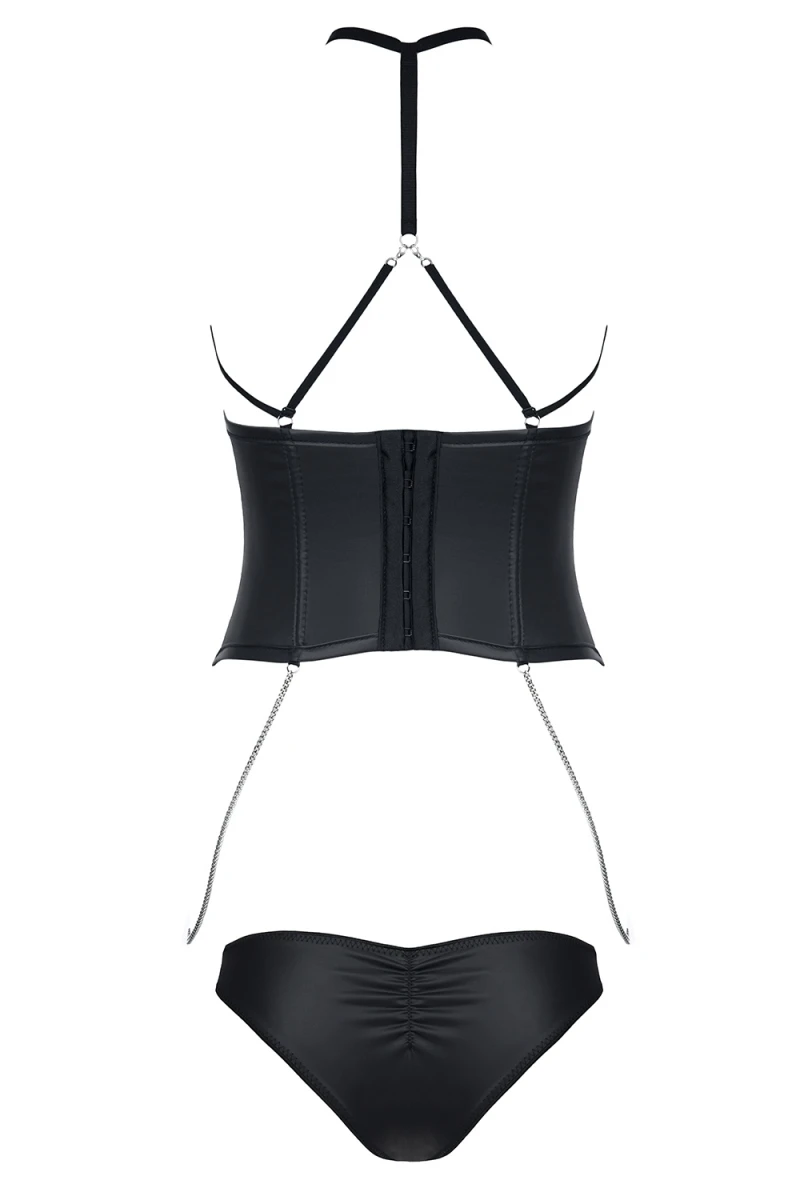 Osez l’expérience que procure le corset ouvert Nikoletta. Vous pourrez profiter de son jeu de matières qui va d’un aspect vinyle au centre à un tissu mat au-dessus des hanches. On parle aussi de ses chaînettes qui parcourent le corps en prenant soin d’entourer la poitrine ; un fabuleux accessoire qui attire l’oeil ! Des armatures sont disposées sous la poitrine pour accentuer leur galbe, son maintien sera subjectif.