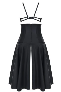 La jupe est taille haute et remonte juste sous la poitrine, gainant au passage tout le ventre et la taille. Le centre est opacifiĂ© par un tissu wetlook ornĂ© d’Ćillets mĂ©talliques rappelant un cĂŽtĂ© corset trĂšs sexy. Les hanches sont habillĂ©es de la rĂ©sille avant de laisser tomber toute la matiĂšre laquĂ©e comme une jupe sur les jambes.