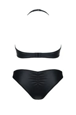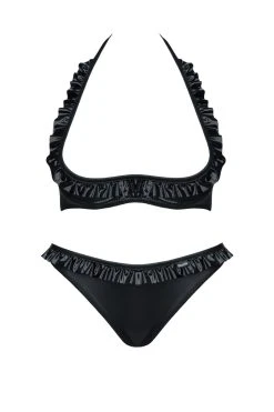 Très léger, l’ensemble Mia voulait faire plaisir aux femmes qui ne veulent rien de superficiel. Toujours dans une matière brillante cousine du vinyle, cet ensemble ouvert est plein de caractère et donne un peu de provocation. Le redresse-seins laisse tout le haut du corps et la poitrine découverts tout en la soulignant de quelques froufrous. La culotte pantie est échancrée pour donner le meilleur galbe possible aux fesses. Le top se ferme par des agrafes dans le dos.