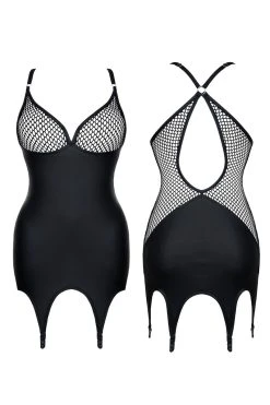 La nuisette détient six jarretelles fixes qui permettent de maintenir des bas assortis. La résille se combinant le mieux avec la reprise de maille au dos. Les bretelles croisées offrent une ouverture au niveau des reins, et son réglables.