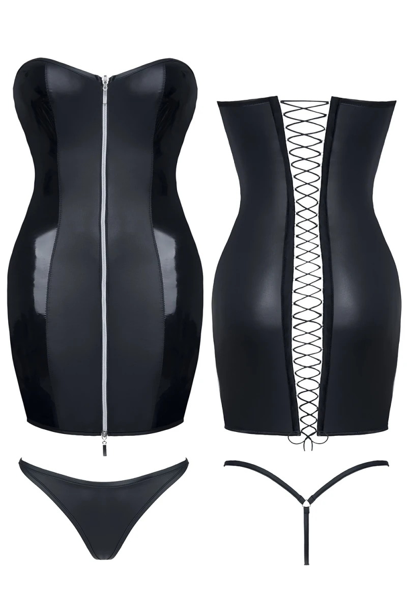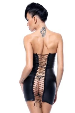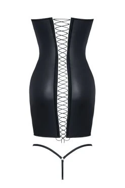Au dos, une ribambelle de laçages se croisent au centre du corps, dévoilant ainsi une partie des fesses et du dos. Élastiques et réglables, ces liens pourront aussi servir à un meilleur ajustement de la robe sur vous. Le string ficelle est assorti et inclus.