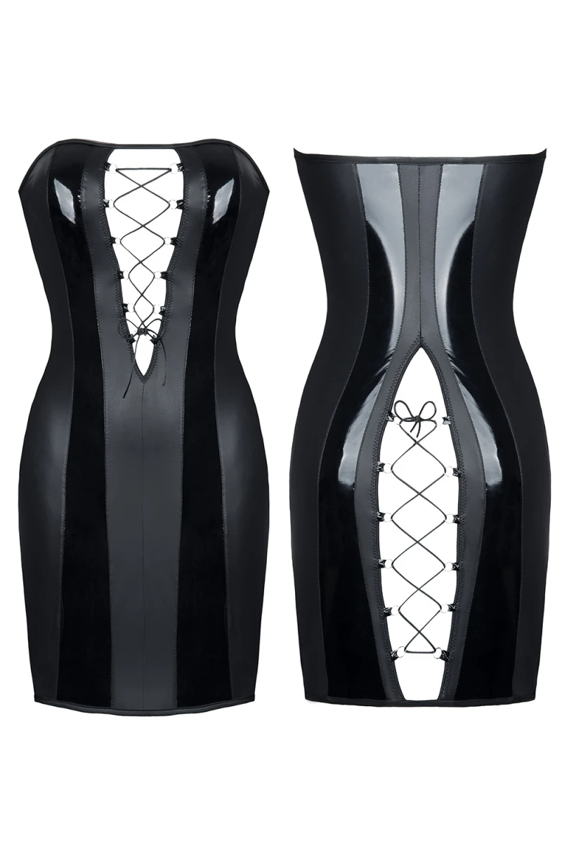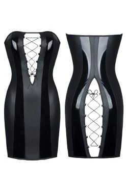 La robe courte Irma est certes osée par sa coupe, mais beaucoup de son caractère est dû au choix de la matière. C’est un tissu brillant noir qui s’apparente au vinyle qui lui donnera le style bad-girl et sa touche de provocation. Cette robe courte et moulante est aussi rehaussée par deux ouvertures qui n’hésitent pas à dénuder le corps : devant, la poitrine profite de cette ouverture pour créer un décolleté aguicheur tandis que derrière, se seront les fesses qui se montreront sans le moindre complexe.