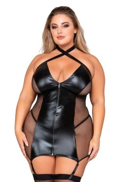 Son alliance entre faux-cuir et résille permet de créer un côté mystérieux tout en validant son audace. La fermeture éclair intégrale qui se pose au centre du corps créera l’envie d’en profiter. Une ouverture complète est possible.