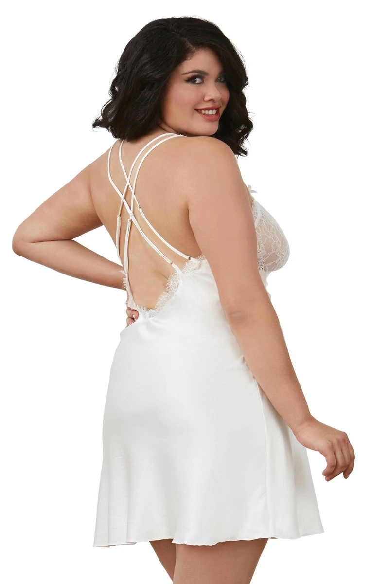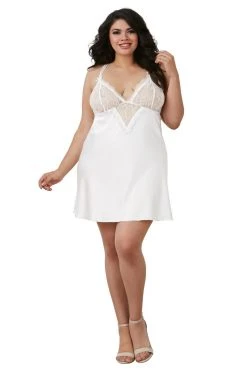 Votre charme prendra une toute autre dimension en portant la nuisette satin blanc. Sa matière finement brillante est recouverte d’une teinte innocente et glamour. La poitrine profitera d’une petite dentelle florale dont le décolleté sera sublimé par une encolure en V.