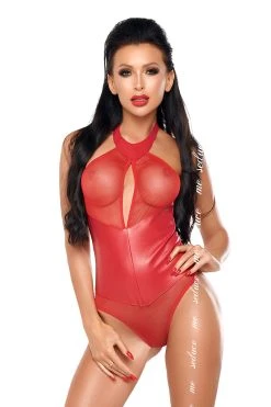Choisissez entre le rouge et le noir pour votre body Imane parfait. Un style fabuleux créé par un mélange de matières qui donnera des frissons. La lingerie coquine est maintenue par un tour de cou qui retient un voile transparent découvrant la poitrine. Une petite ouverture au centre du buste donne une touche supplémentaire pour attirer les regards.
