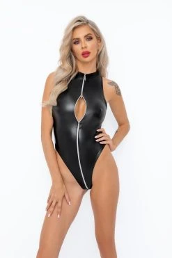 Si vous recherchez une tenue percutante et provocante, le body zip wetlook F294 est peut-être fait pour répondre à vos attentes. L’esprit fétiche est omniprésent et représenté par une matière noire qui moule le corps comme une seconde peau.
