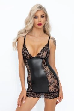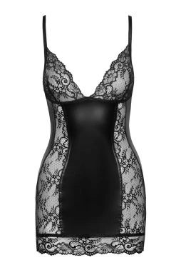 Cette jolie résille, qui dévoile le corps en toute transparence, est disposée sur la poitrine, puis sur les côtés du corps en contraste au vinyle noir et opaque.