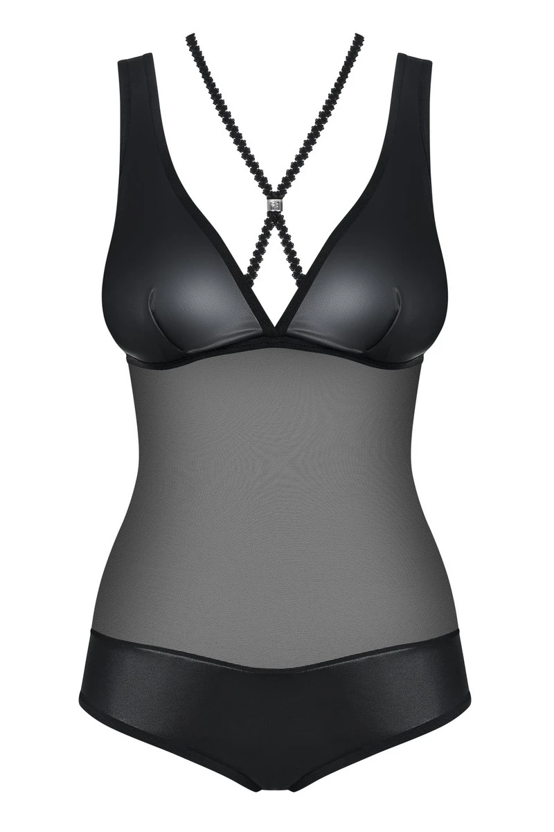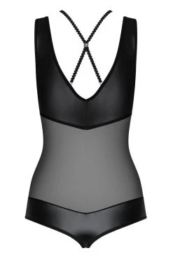 Profitez du haut pouvoir d’attraction du body wetlook Leatheria ; avec sa transparence à couper le souffle et ses touches de matières proches du vinyle, son style ne cessera de vous mettre en valeur. On a un décolleté en V qui n’est pas trop gourmand, il est toutefois habillé d’un tressage qui se croise au centre du buste pour continuer au dos.