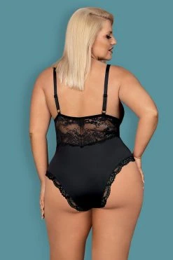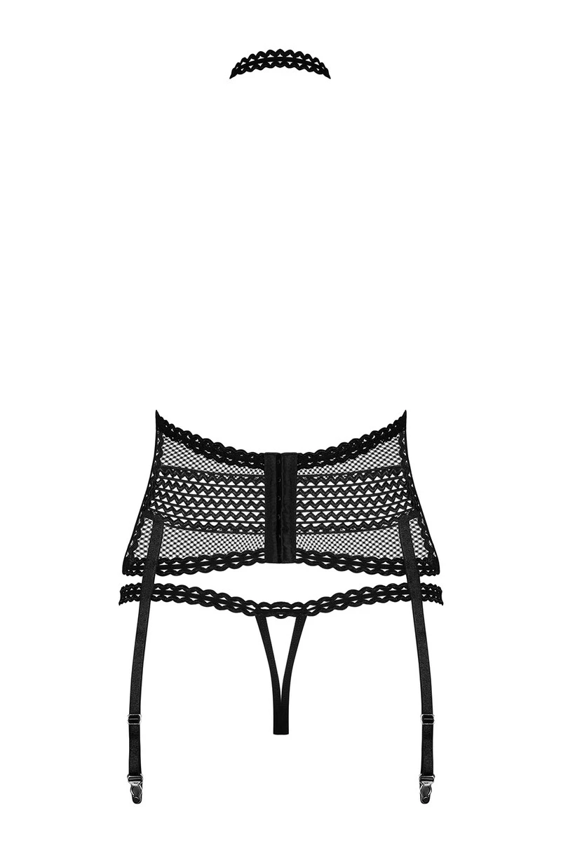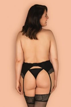 On ajoute les 4 jarretelles réglables pour pouvoir habiller les jambes des bas de votre choix. Et pour continuer dans la provoc’, le string inclus s’ouvre à l’entrejambe. Matière extensible.