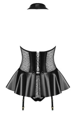 La fantaisie qui s’associe à une matière wetlook piquante fait la guêpière 859-COR une lingerie originale à posséder. Laisser son style parcourir votre corps de haut en bas pour donner à votre silhouette une allure sensuelle. Tout partira du tour de cou, les épaules dénudées et une ouverture au centre de la poitrine créant un décolleté goutte d’eau. La fermeture éclair est placée juste en dessous.
