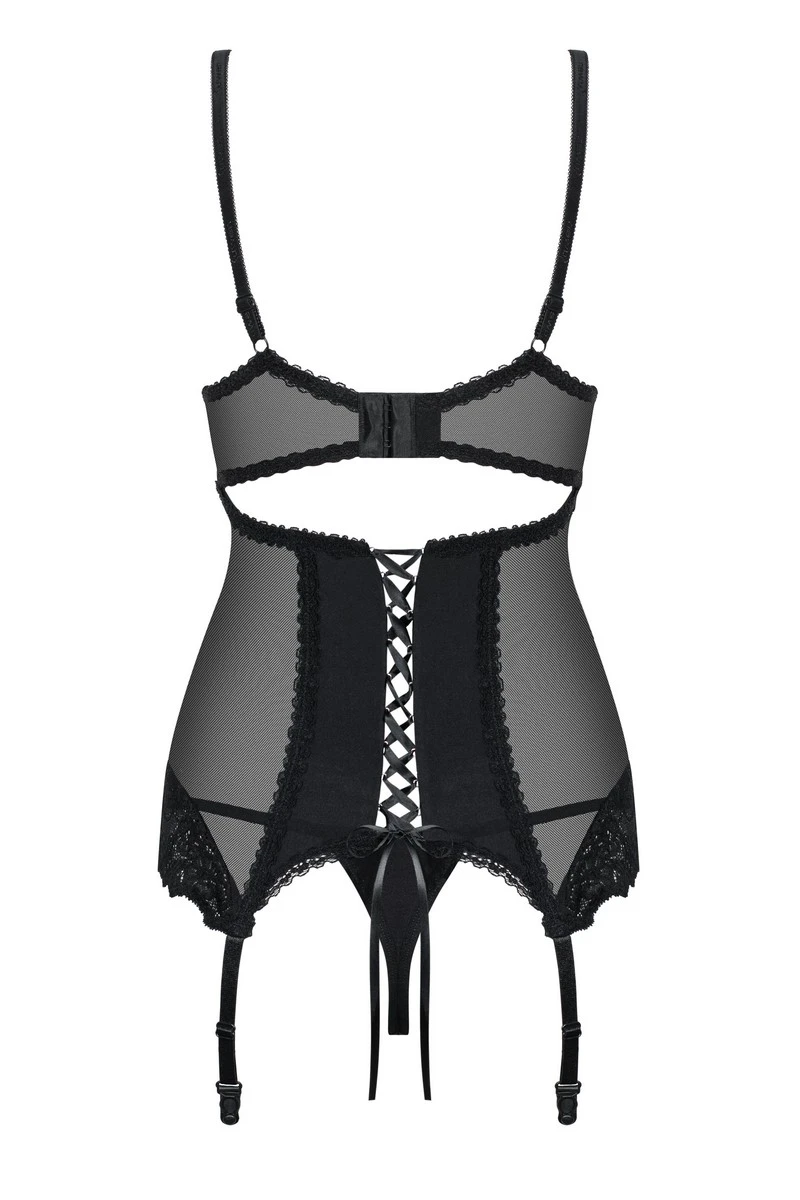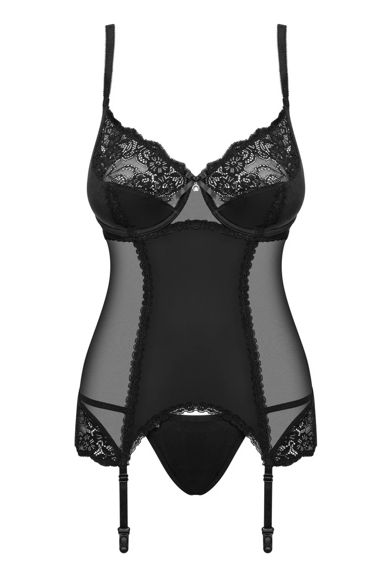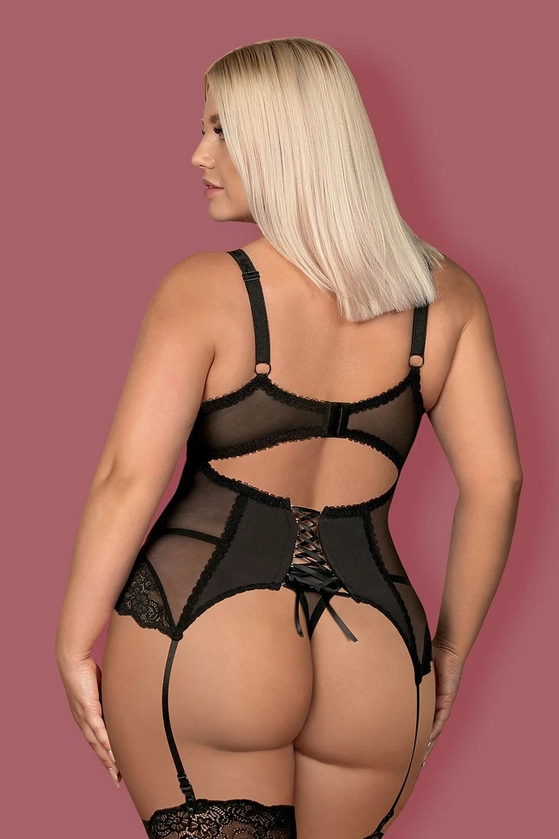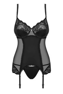 La coupe de la guêpière affine la silhouette tandis que la partie centrale permet une opacité plus agréable. Le string ficelle est inclus ; bretelles et jarretelles réglables.