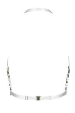 Un effet harnais se dessine sur le haut du buste, toujours avec des possibilitĂ©s d’ajustement. Les seins sont dĂ©voilĂ©s et soulignĂ©s par ces liens ornĂ©s de rivets mĂ©talliques. Les bretelles sont retenues par des anneaux en mĂ©tal qui accentuent le pouvoir de la tenue.