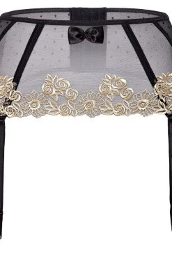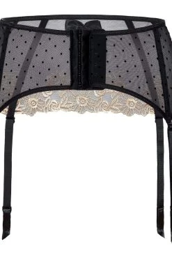 Comme sa collection, il est confectionné dans un voile noir bordé de broderies florales se posant sur le bas du ventre. En son centre, on note un délicat noeud satiné qui attirera l’oeil. Le dos est recouvert d’un motif à pois qui s’imprimera directement sur votre peau. Fermeture du dos par agrafes, jarretelles réglables.