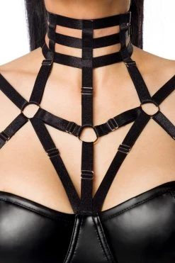 Le top moulant profite d’une coupe bustier qui met la poitrine en valeur, ainsi que d’une décoration en harnais maintenue par un tour de cou érotique qui valorise le haut du corps . Tout est réglable pour vous donner le meilleur style possible.