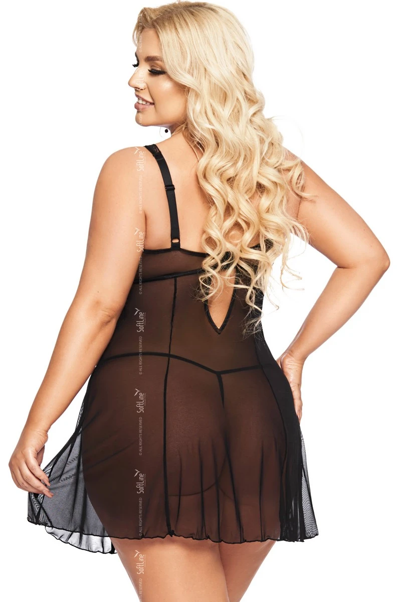 Le tulle vaporeux se laisse tomber sur vos hanches sans coller à la peau. Fermeture de la nuisette dans le dos par des agrafes dotées de plusieurs rangées. Le string ficelle est inclus, les bretelles sont réglables.